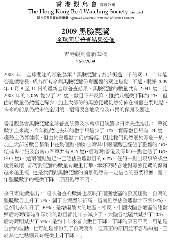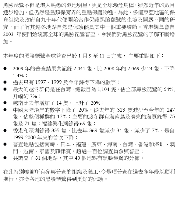 » 2009黑臉琵鷺 全球普查結果 Results of 2009 Intl BFS Census