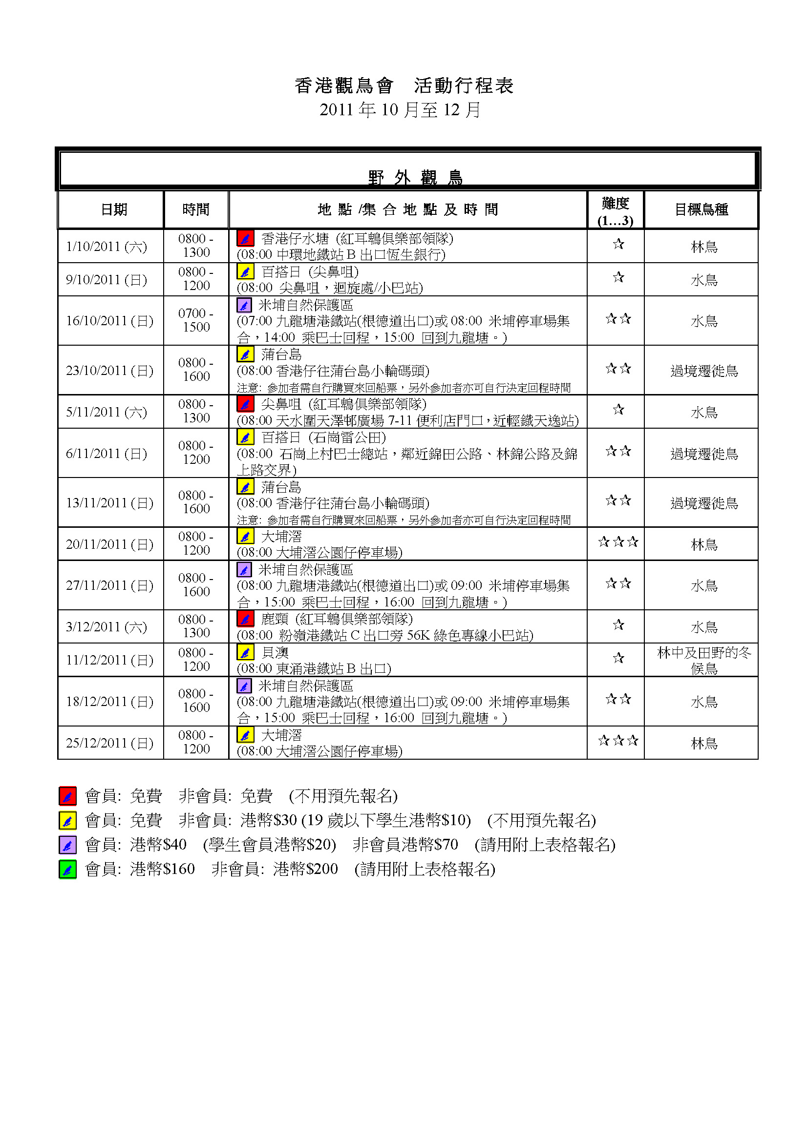 2011年10-12月戶外觀鳥活動時間表 Oct-Dec 2011 Outing Timetable