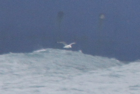 Having missed the chance to sea-watch on Wednesday evening, I was determined to go on Thursday morning whatever the weather – very windy with mist and drizzly rain at times. I was rewarded by a flock of Streaked Shearwaters presumably brought into in-shore waters by the very strong easterly wind and mist – I counted five flying south-west in the mist at 8.30am followed by eight coming back the other way at 8.45 and then six going south-west again at 10.15. I think they were all the same birds but never very close – here’s my best photo.