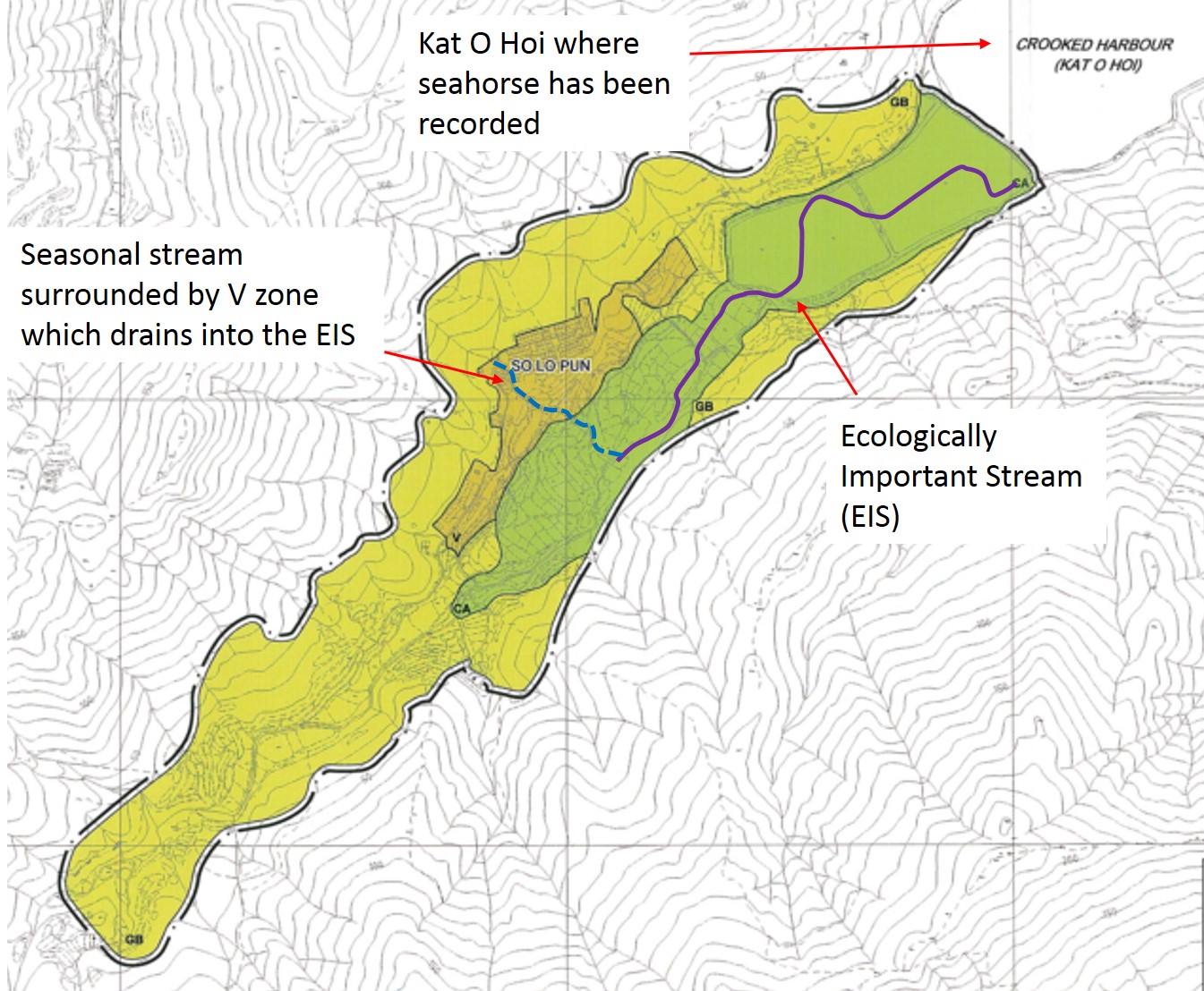 Seasonal streams form the tributaries of the EIS. One of which is surrounded by the proposed V zone where agricultural uses are always allowed (Figures 1 and 2). The development of small houses and the associated change of land use will increase the pollution load runoff into the tributaries and eventually into the EIS. The recorded population of fish species Oryzias curvinotus as well as other sensitive habitats and species downstream (seagrass bed, marsh and seahorse) would be impacted by water pollution. There are few unpolluted natural low-land streams remaining in Hong Kong, all measures to protect the EIS and its tributaries should be taken, this includes the provision of a sufficient buffer area (~20m) to protect any existing riparian vegetation. It is the Planning Department’s duty to retain these significant ecological attributes and to control adjoining uses to minimize adverse impacts on conservation zones .
