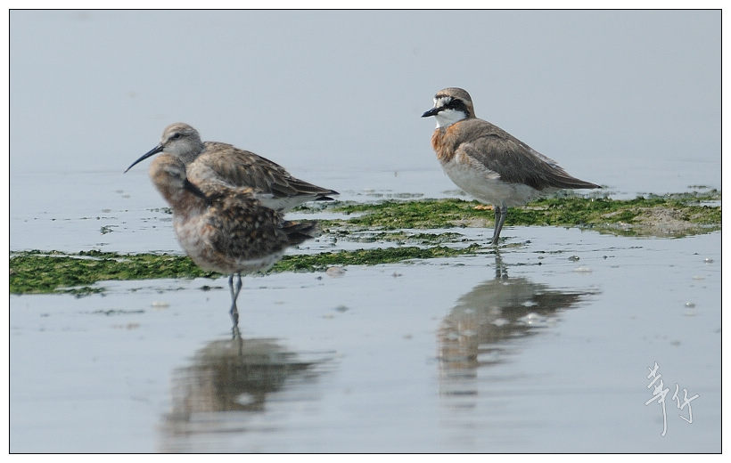 Compared to Greater Sand Plover, notice the shorter, thicker bill and darker brick-pink (not orange) breast band, which extends furt ...