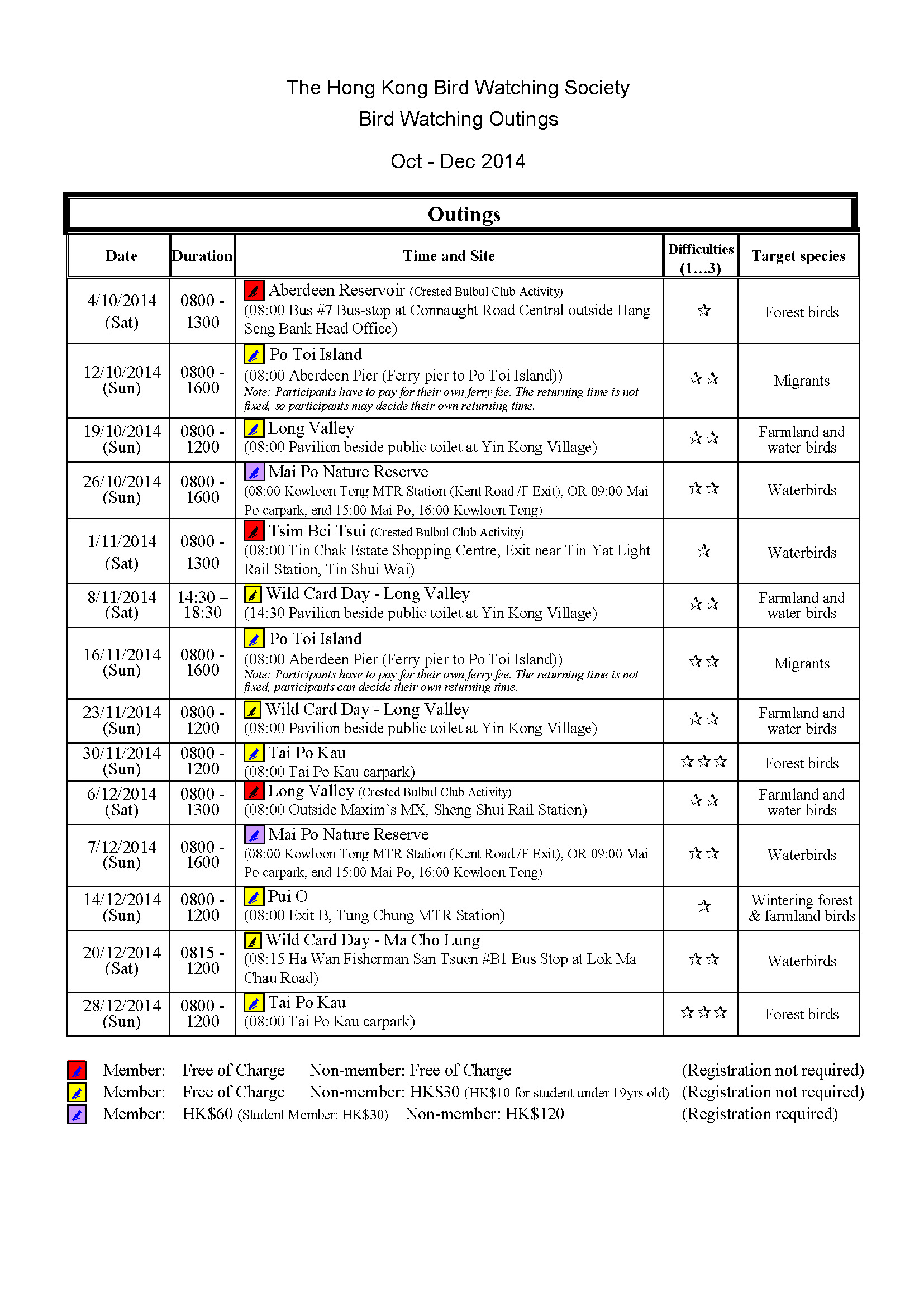 2014年10-12月戶外觀鳥活動時間表 Oct-Dec 2014 Outing Timetable