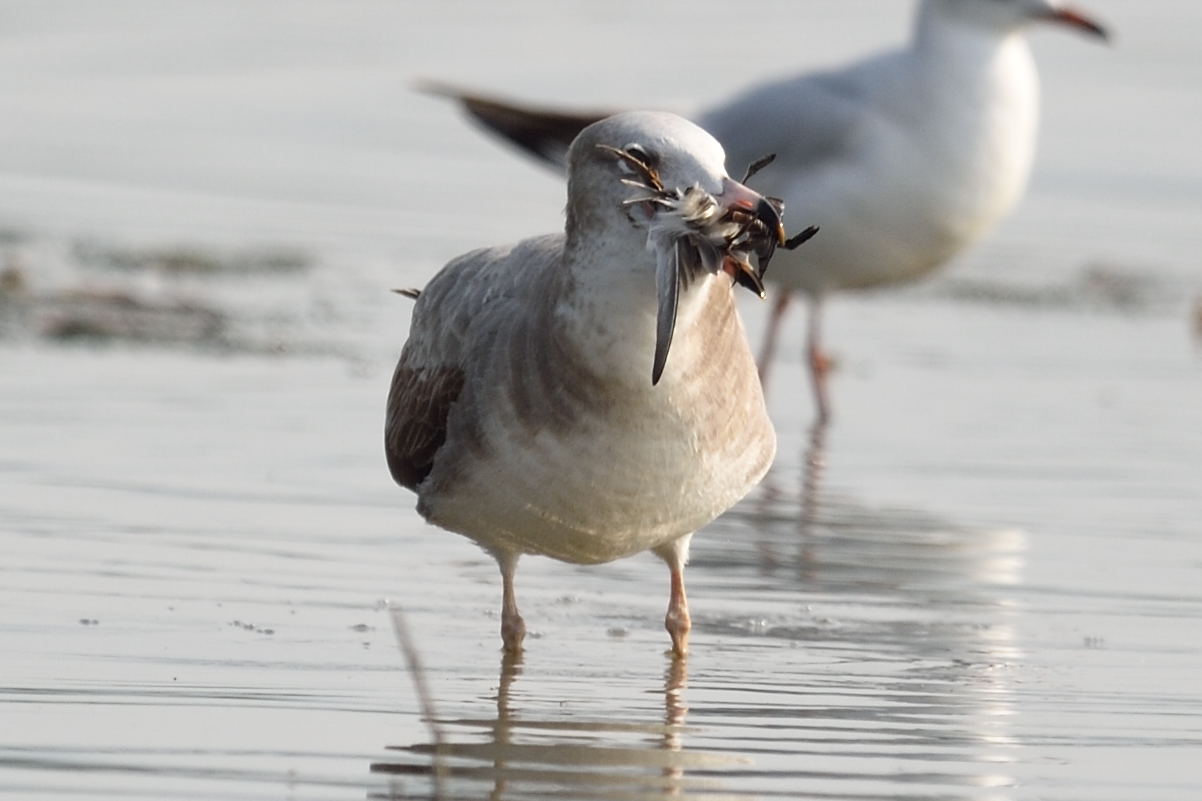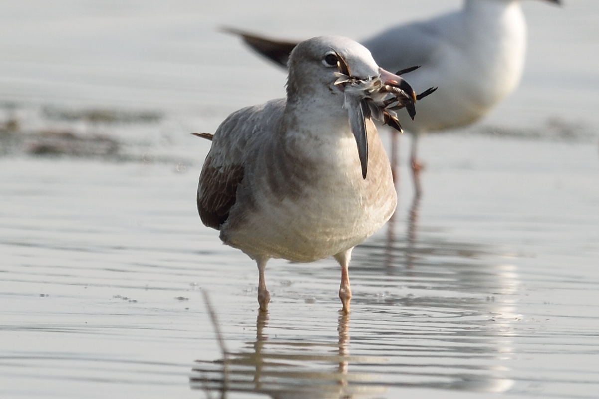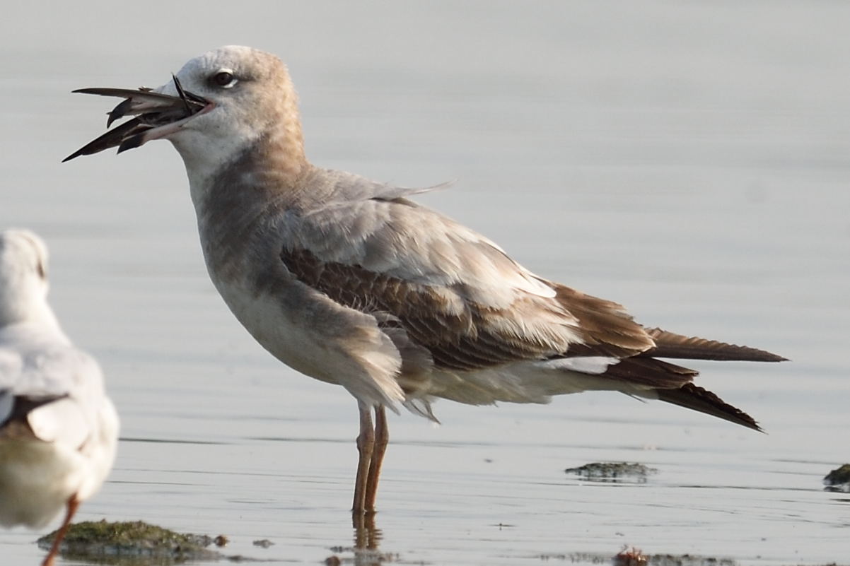 The gull is a first-year Black-tailed. The food item appears to be a tiny, black-legged shorebird, so most likely Red-necked Stint.