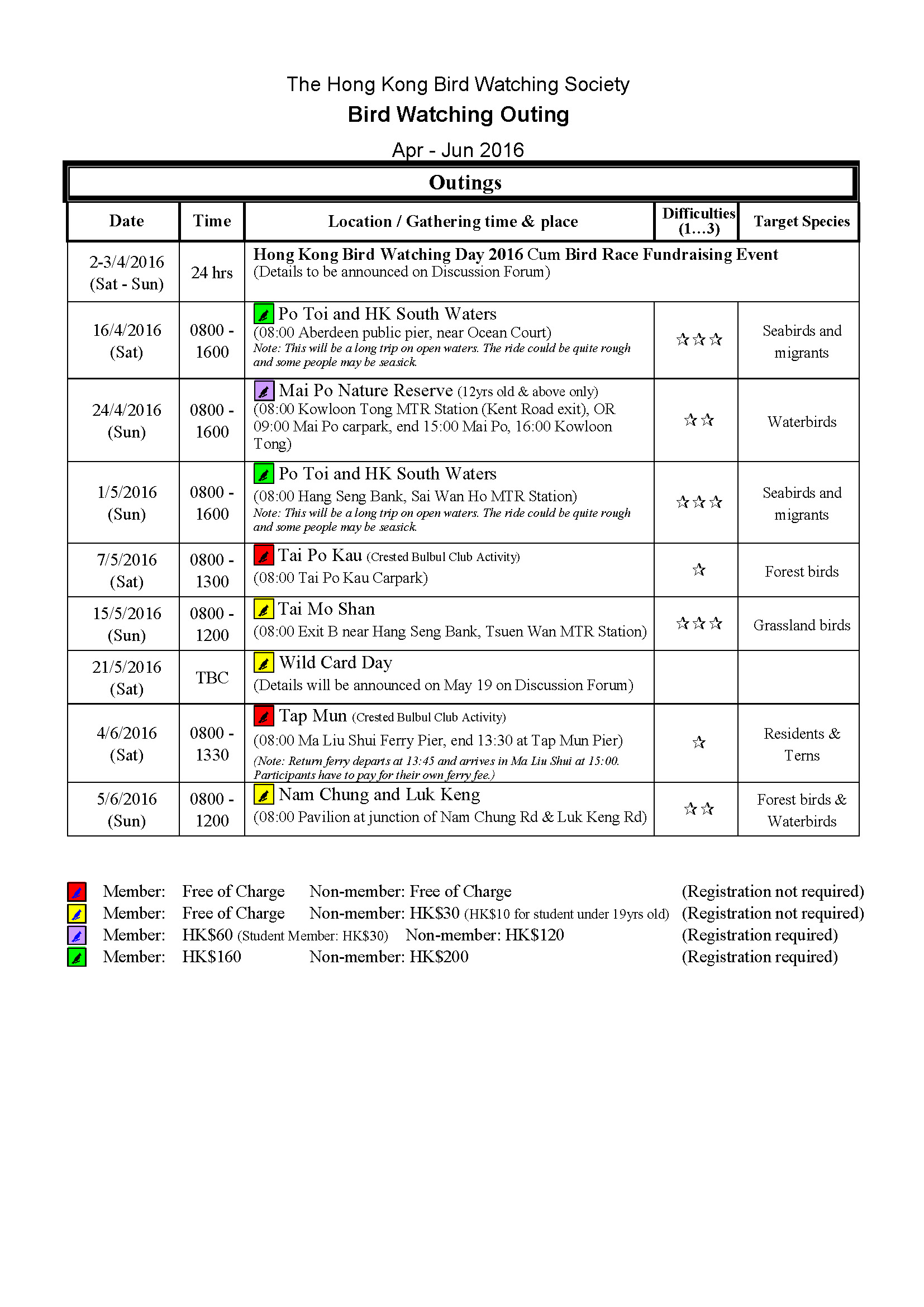 2016年4-6月戶外觀鳥活動時間表 Apr-Jun 2016 Outing Timetable