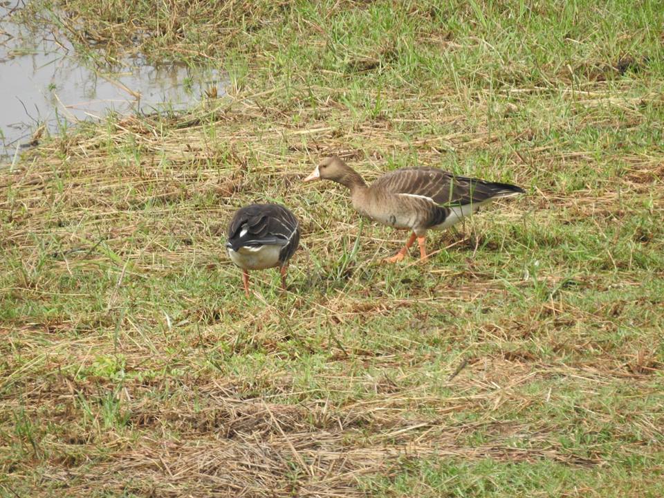 Two white-fronted geese, not sure it is a greater or a lesser one.