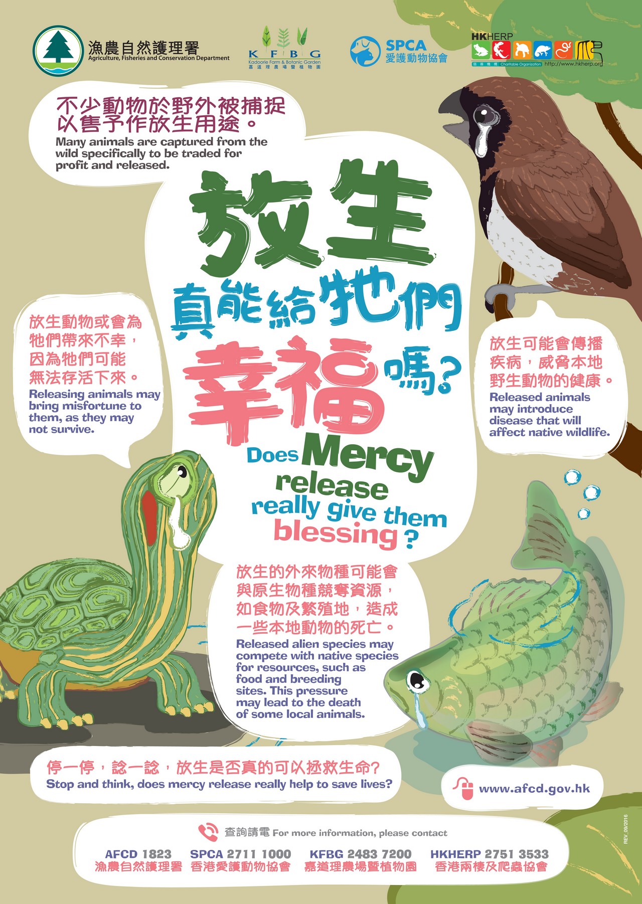 AFCD has recently published a new poster to promote proper understanding of mercy release activities and to raise public awareness on animal welfare. Feel free to share and spread the message!