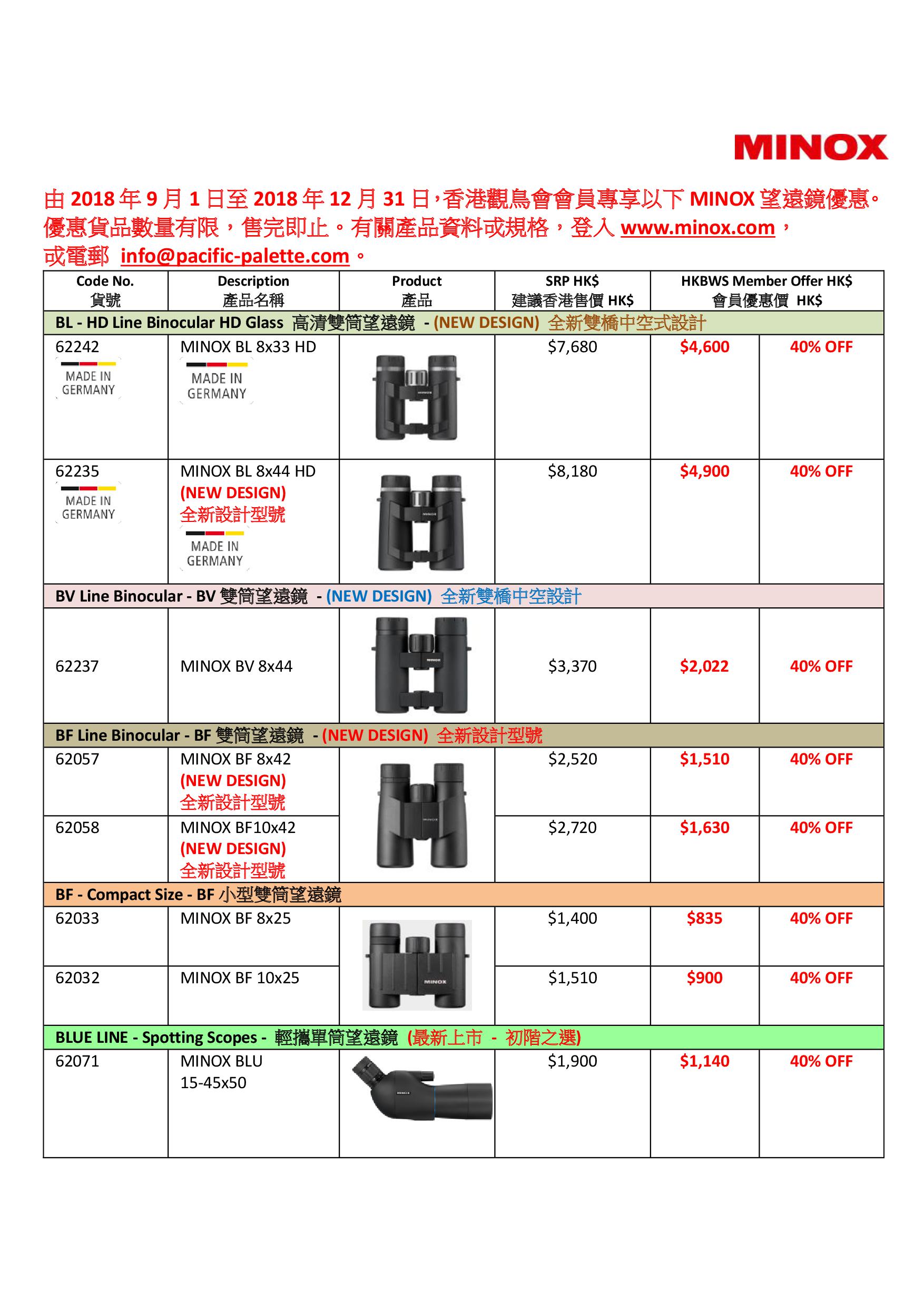 Author: HKBWS Bonnie Time: 31/08/2018 10:26 Subject: 美樂時望遠鏡優惠 Special Offer of MINOX Binoculars 2018/09-2018/12