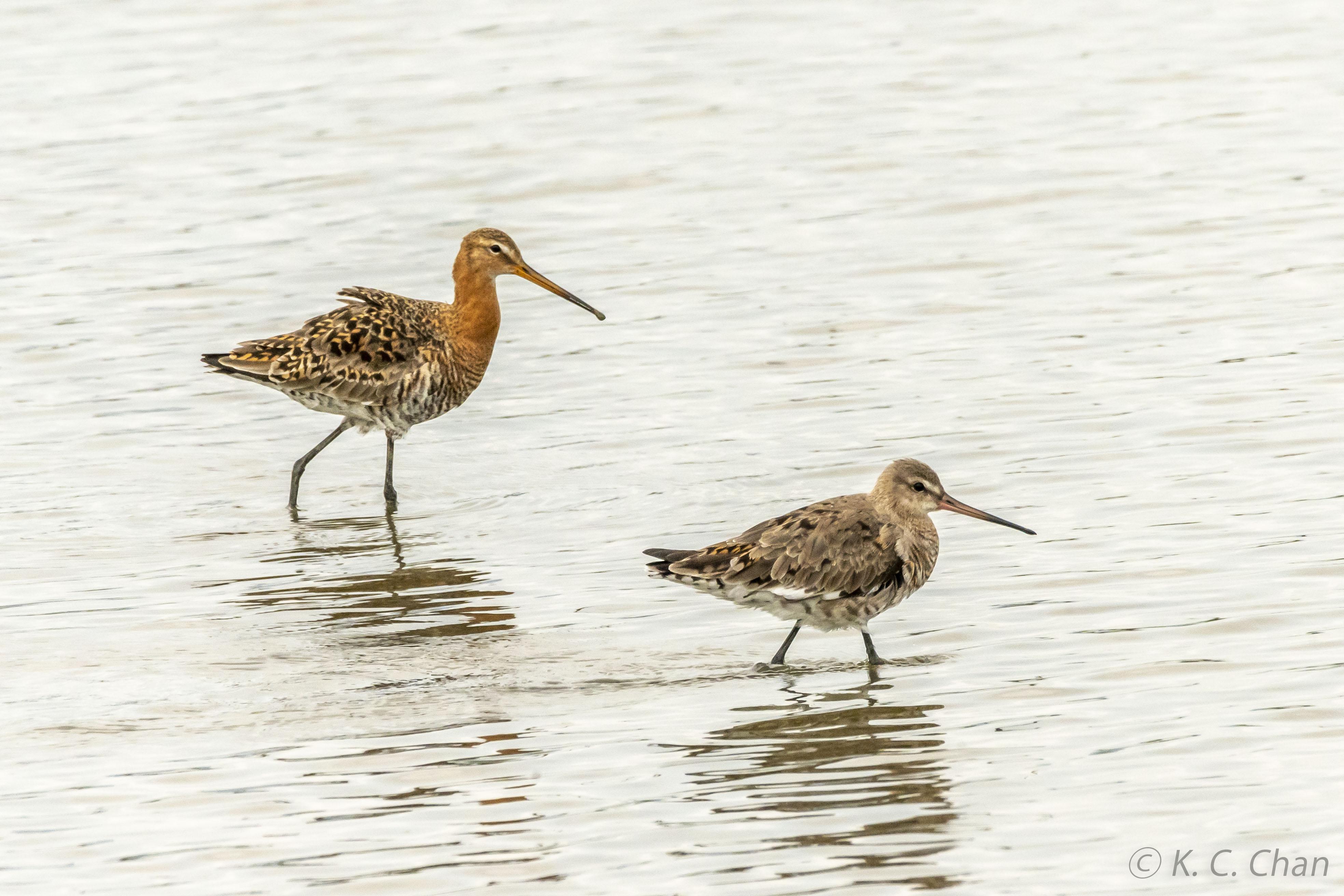 It should be a bar tailed, bar tailed in non breeding plumage are pale with pink bill with black tip, but the black tailed godwit, the bird at the background, is in breeding plumage, has a yellow beak with a black tip.