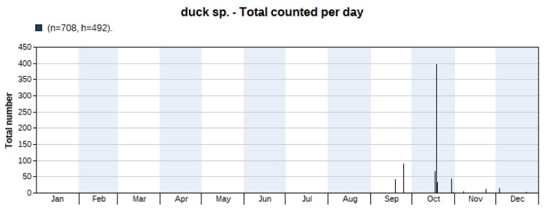 Unidentified ducks appeared from mid-September, but October had the highest total count (544), with a maximum of 398 individuals on 18th. It’s a surprise to me that we didn’t see more ducks in November and that the peak was in mid-October. The distance to these fast-moving birds, bad lighting and/or heat haze were the reasons why I could not identify them to species level, certainly not female-type birds. A total of 708 were counted during the year.