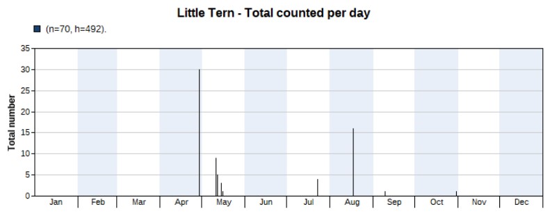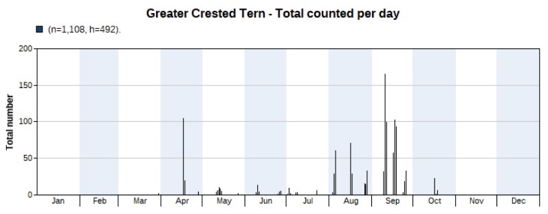 A bit of a tricky species to count, as it is also a local breeder and these birds might fly along the same route, to feed out at sea, as migrants do. So counting locals for migrants cannot be excluded. The graph below nevertheless shows our attempt to only count what we believed to be migrants. And then we see two peaks, in May and in August. A total of 1,800 individuals was counted, with highest counts of 328 on 12 May and 327 on 16 August. The last Bridled Tern of the year flew by on 25 September.