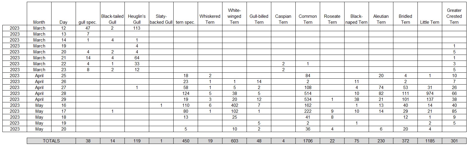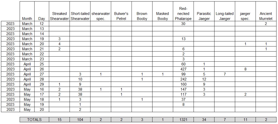 This is an overview of all (migrating) seabirds and all (migrating) terns and gulls seen during the spring (i.e. March, April and May) of 2023. Below are the totals for the whole season.