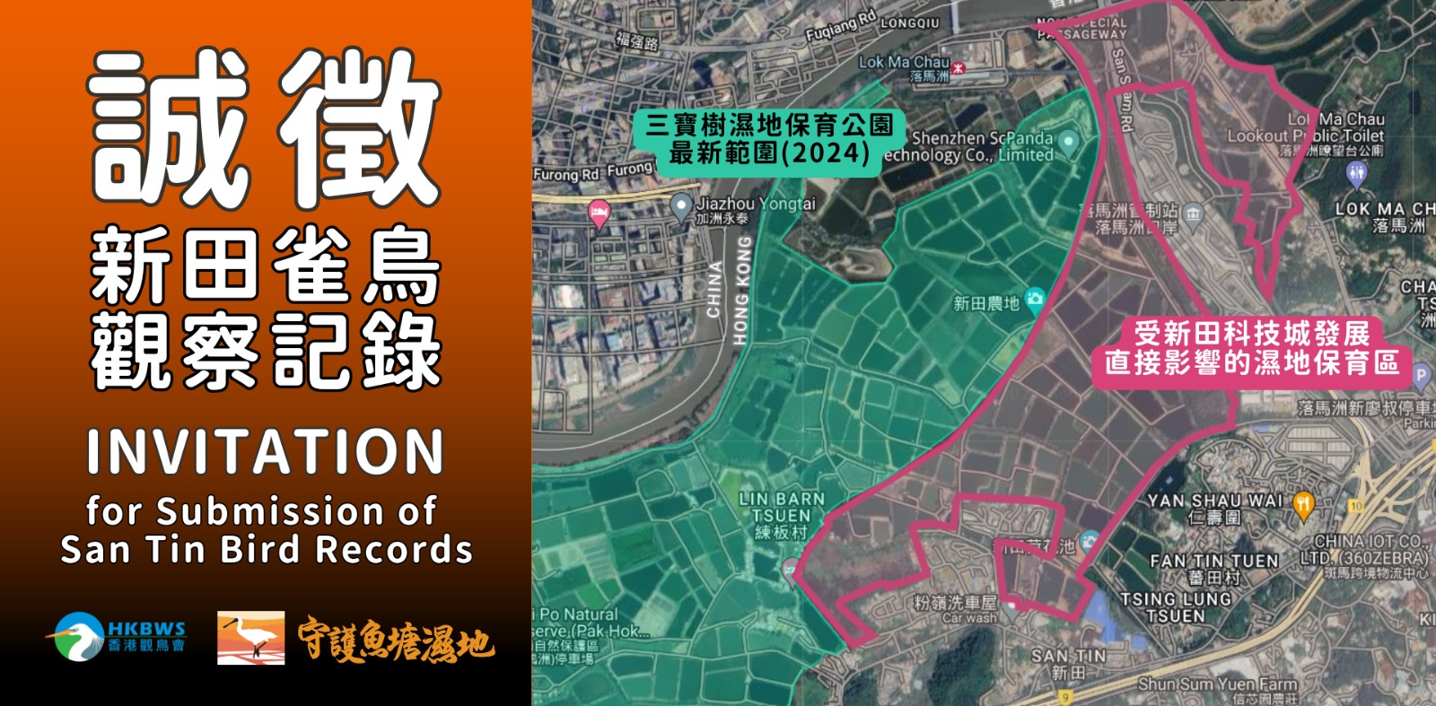 政府2023年推出新田科技城,發展將佔用逾150公頃的「濕地保育區」,更涉填平新田及三寶樹魚塘濕地逾90公頃,首批工程更料於2024年年尾展開。根據香港觀鳥會整合鳥友提交的雀鳥記錄,受影響濕地保育區內至少有209種雀鳥的記錄。我們誠意邀請大家繼續提交您在新田及三寶樹一帶的鳥類觀察記錄。這些資料極為珍貴,能幫助我們繼續爭取修訂發展、保護濕地的機會。即使這些機會渺茫,即使這些數據很可能會成為歷史,我們亦希望能為未來、下一代留下記錄。