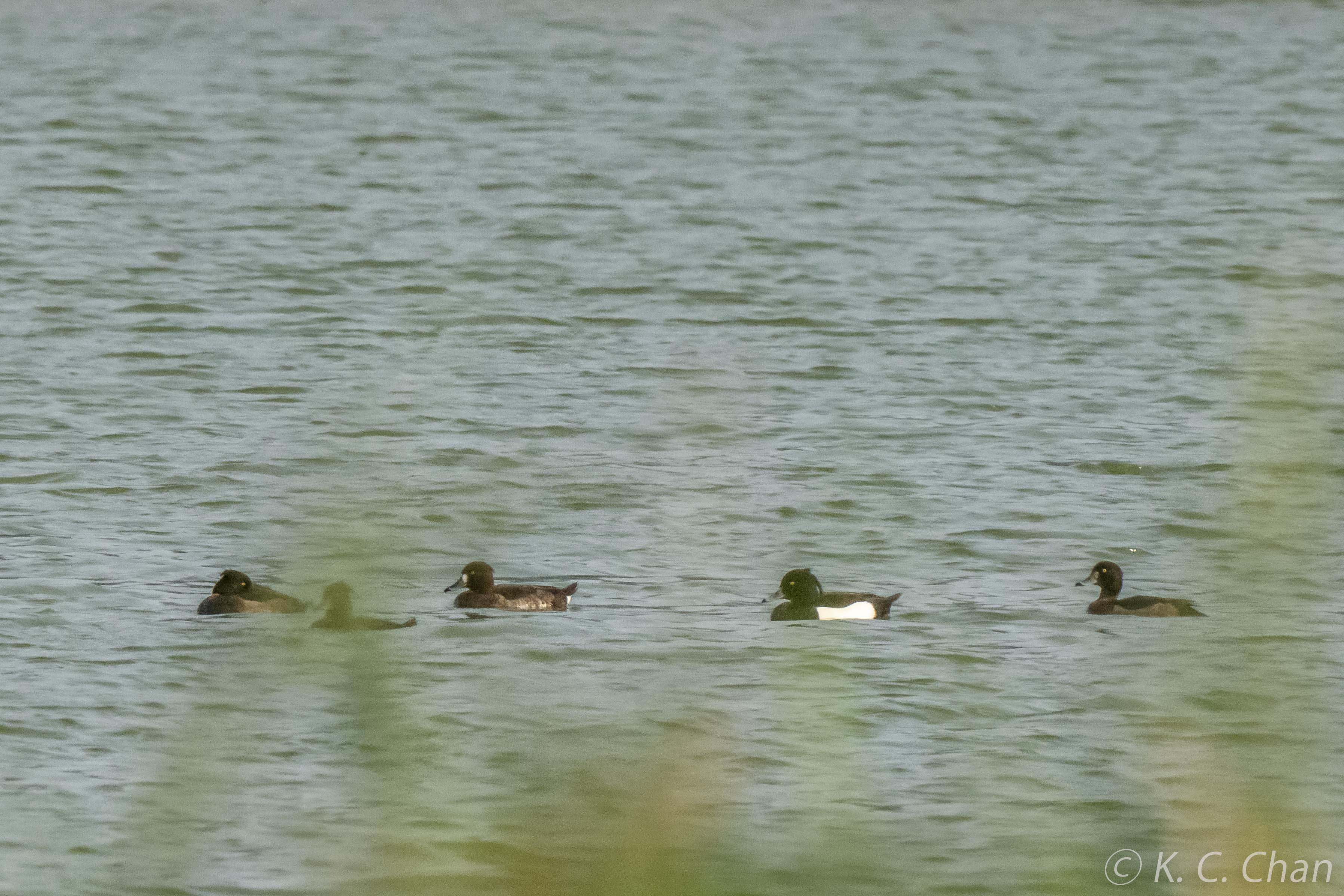 It's also a Tufted Duck in my opinion - head is not rounded like that of a Greater Scaup - it does have a 'tuft', and the bill is the wrong shape for that species. It's the same shape as the Tufteds in the shot and the eye colour is the same too. Female Tufted often showed quite extensive white around the bill.