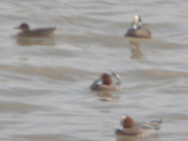 I have tried to take picture by digiscoping but the result was not good due to long distance and the birds' movement. The attached photo only shows the distinctive white crown of the bird. Actually the white crown and the lateral green patches behind the eyes make the bird stands out sharply against the Eurasian wigeon.