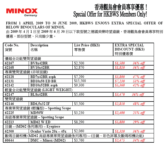 Subject: Extra Special Offer of Minox Binoculars 美樂時特選貨品再優惠 [Print This Page] Author: HKBWS WY Time: 4/06/2009 17:38 Subject: Extra Special Offer of Minox Binoculars 美樂時特選貨品再優惠