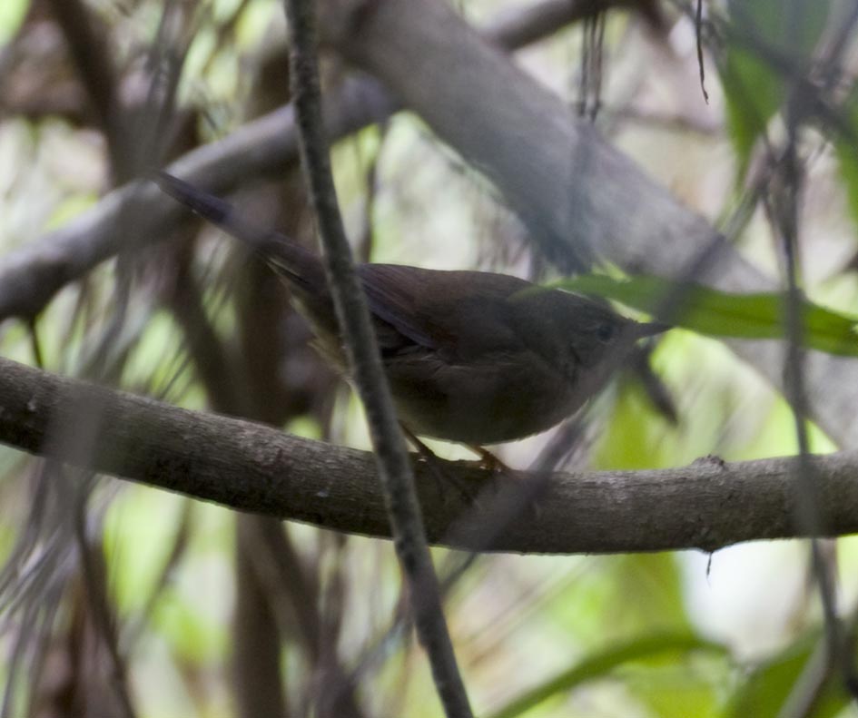 Please correct us if the ID is wrong! The bird was very active and stayed in shade, calling with endlessly repeating rough rattle "tsuk-tsuk, tsuk-tsuk". We did not notice any white barring on the vent, and the lower mandible looks bright orange in the field, with prominent eyering but no noticeable brow.