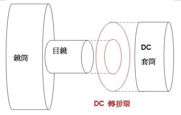 3.把兩邊連接起來的叫做 "轉接環" , 又稱 "甜甜圈" , 內徑跟外徑都有螺牙 , 可以分別鎖在目鏡及 DC 套筒上 , 日本系統的目鏡上都有螺牙可以讓你接 "甜甜圈" , 整體構造很簡單, 一般來說你只要傷腦筋在如何買到適用你目鏡口鏡接你 DC 套筒口徑的甜甜圈, 沒有任何困難的地方, 當然, 如果目鏡上沒有螺牙就無法鎖上甜甜圈, 我看很多人的問題感覺好像...是否歐系系統目鏡上沒有螺牙, 所以如何連接才變成一個問題