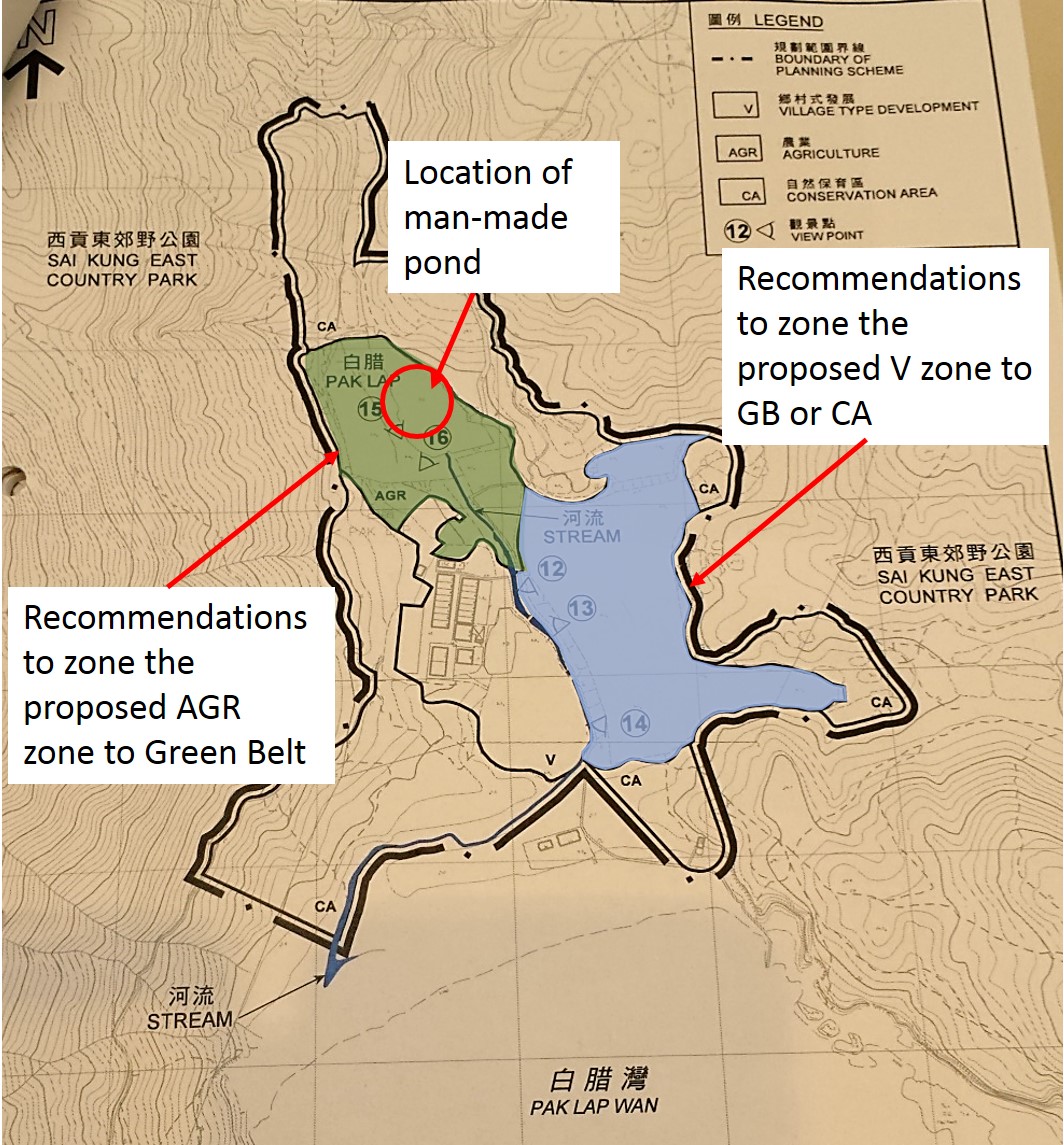 The proposed Agriculture (AGR) zone is located in an area of young plantation species and man-made pond. This area is hydrologically linked to the stream which drains into Pak Lap Wan. Surface runoff from farming activities would result in the increase of organic content in the stream and Pak Lap Wan. We believe this area should be zoned as Green Belt (GB) to prevent water quality issues and also because the GB zoning would create a suitable buffer area of appropriate size between the existing village houses and the proposed CA.