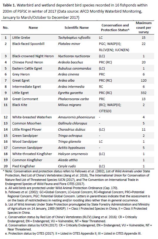 4.4.        Besides, the data presented in Table A6-12 seems to be misleading. The mean count is the average bird usage of the fishponds in the whole year, but the seasonality of birds during a year is neglected (i.e. it is well-understood that there are more birds during winter). Also, the maximum count of some bird species seems to be much lower than that recorded in the Agriculture, Fisheries and Conservation Department (AFCD) Monthly Waterbird Monitoring in the Deep Bay Area[2]. It is uncertain if such difference was due to difference in survey methodology, or the presence/absence of drained-down fishponds. In fact, a total of 20 waterbird and wetland dependent bird species were recorded in 16 fishponds within 200m of PSFSC in winter of 2017 (i.e. January to March, and October to December)(please refer to Table 1 below). In February 2017, 138 Little Egret was found in a drained-down fishpond immediately next to the PSFSC; while in another drained-down fishpond about 140m from PSFSC, 192 Little Egret, 114 Great Egret and 22 Black-faced Spoonbill were recorded. We consider that the fishponds surrounding the PSFSC is of high ecological value and the adverse ecological impacts of the redevelopment works on these fishponds should not be underestimated.