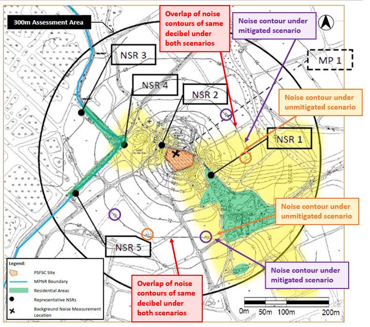 3.1.        A.6.53 of PSFSC EEA stated that “there is no line of sight from the PSFSC (due to screening by tress and, to a lesser extent, by buildings), so the only potential disturbance impact would be that of noise”. The current background noise level at PSFSC is 54dB (Table A3-3 of the PSFSC EEA). Comparing Figures A3-1, A3-2 and A3-4 of PSFSC EEA, noise levels at the residential areas were significantly reduced with the use of 5m and 10m noise barriers under the mitigated scenario (Figure 1). However, there seems to be little noise reduction in the fishponds, wetlands and Gei Wais. The mitigated noise level is still predicted to range from 66dB to 86dB, just like the noise contours in the unmitigated scenario (Figure 2).