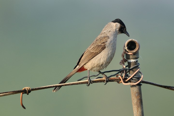 A sooty-headed bulbul mounted itself on a wire checking out worms at an opening of a water pipe in a field at Long Valley on December 31st. It may not realized that the hole of this vertical stem is an opening of an artificial rod.