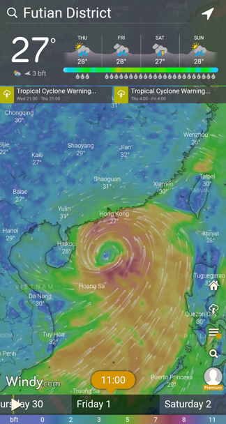 We’ve seawatched on the last day of this month, as part of my very first dedicated storm seawatch survey, with storm signal T8 being in force at some time during the survey. The storm was ‘Tropical Cyclone Chaba’, which moved south of Hong Kong and from east to west. The prediction for Friday (1 July) looked promising on Windy: