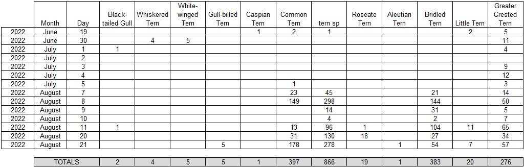 This is an overview of all (migrating, except for the Lesser Frigatebird) seabirds and all (migrating) terns and gulls seen during the summer (i.e. June, July and August) of 2022. Below are the totals for the whole season.