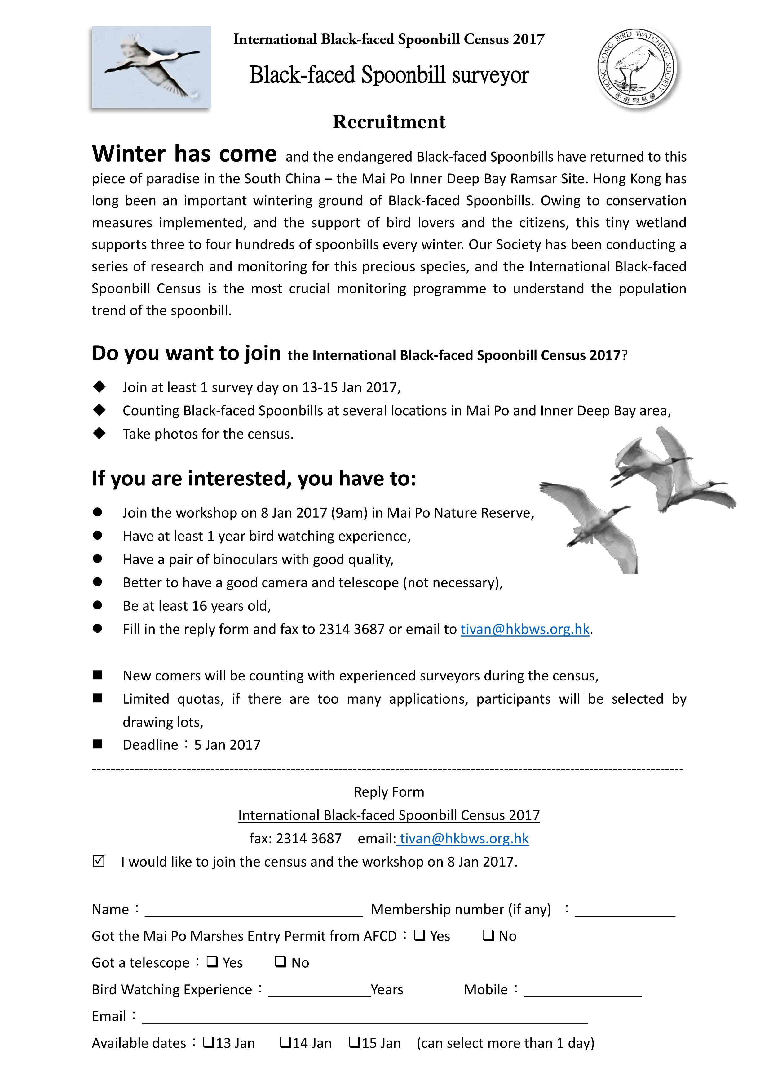 » 2017年黑臉琵鷺全球普查 Intl BFS Census - 普查員大招募 Recruitment