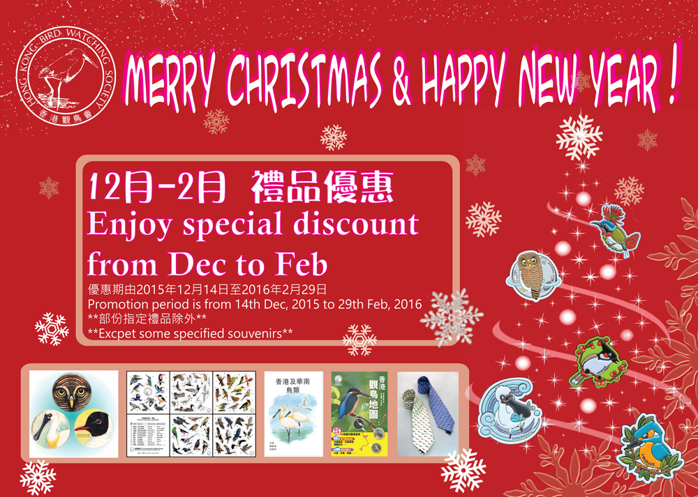 香港觀鳥會現正舉行聖誕及新年大減價,書籍、T恤、魚塘陶瓷杯墊及雀鳥襟章等禮品均以優惠價發售,由即日起至2016年2月29日,歡迎親臨本會或以郵購服務選購。趁此難得機會,一邊購買特別的節日禮物,一邊支持香港雀鳥保育!(詳情可參閱優惠價目表)