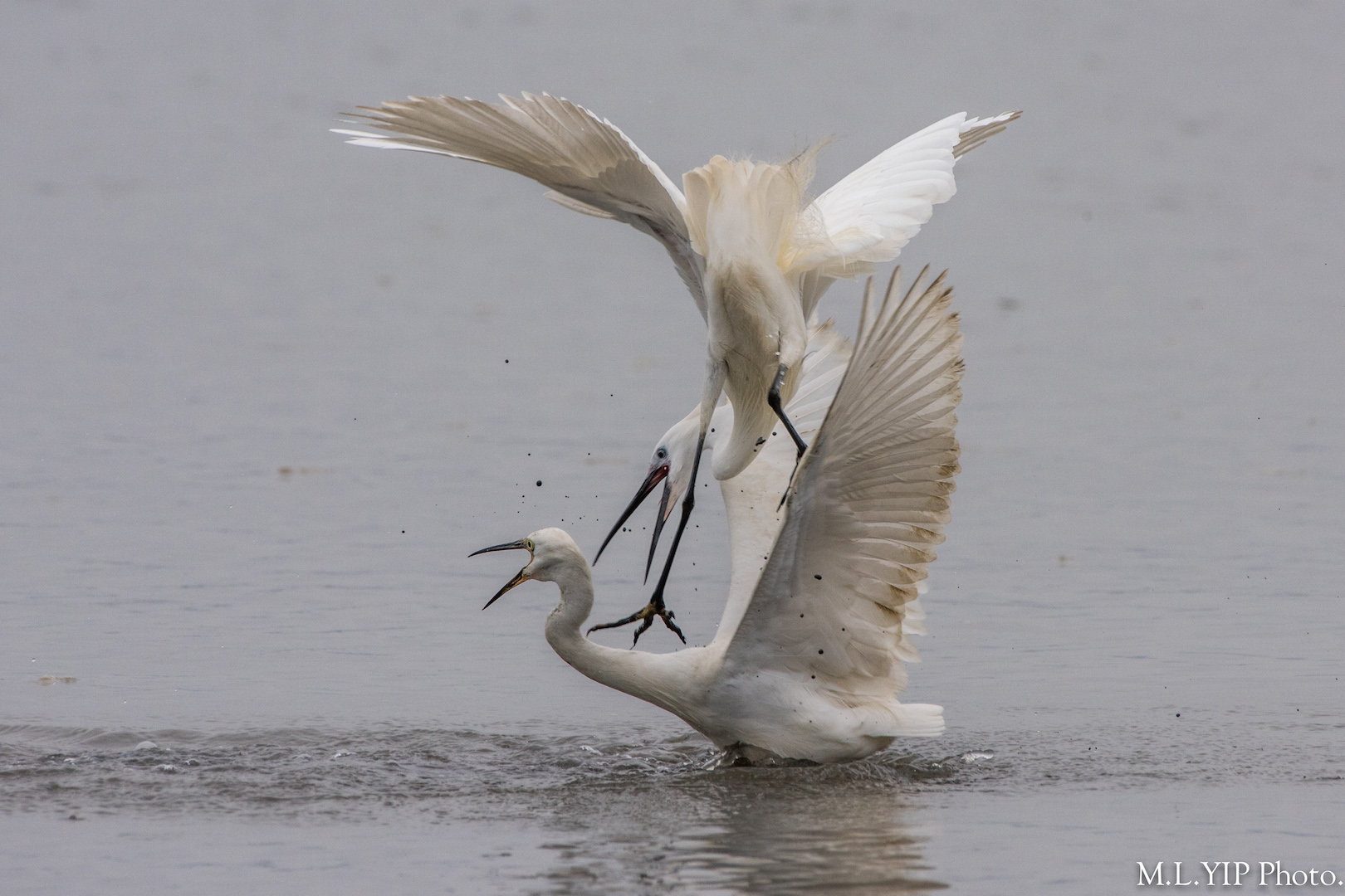兩隻小白鷺為爭奪覓食地盆,大打出口.