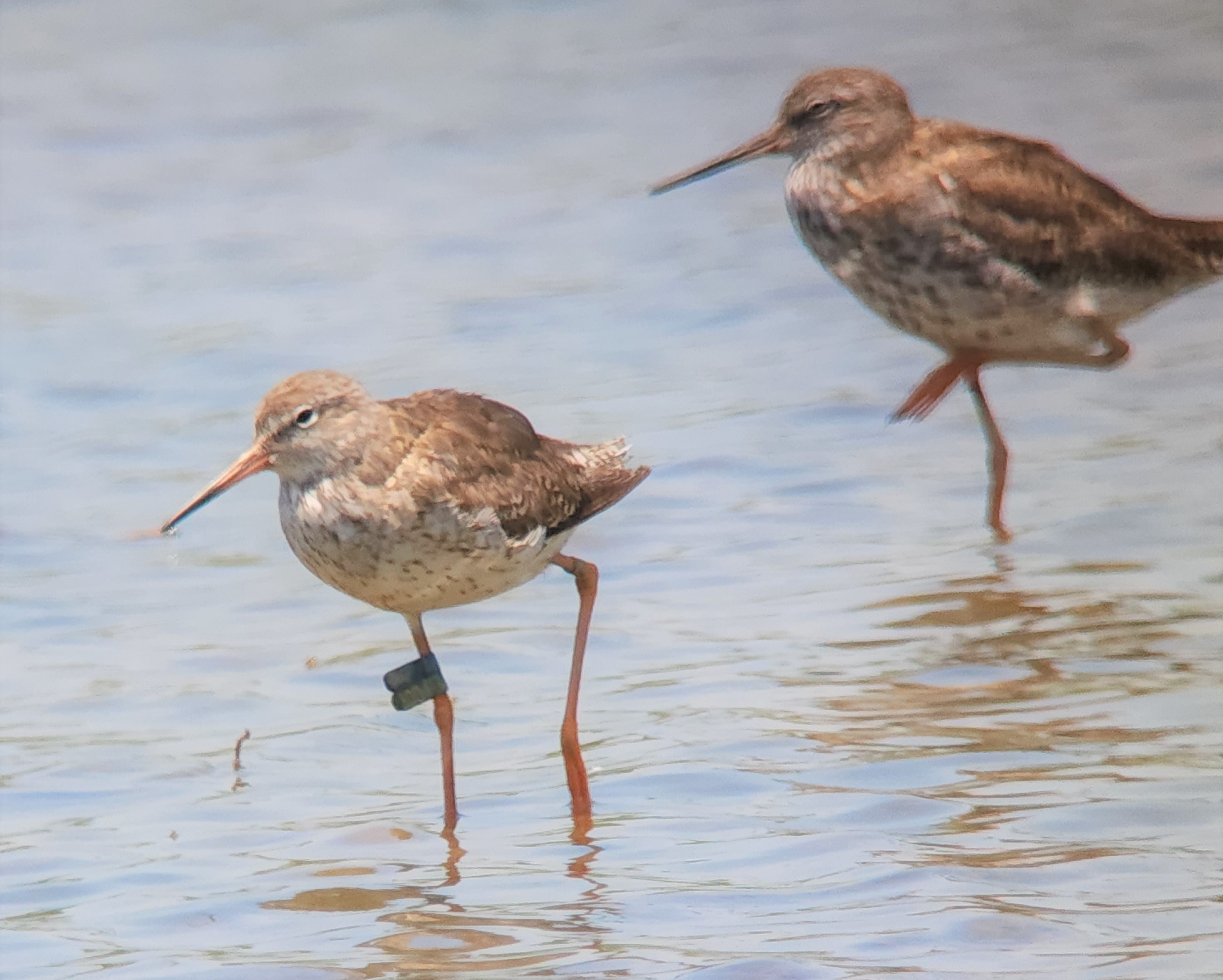 Common Redshank: Leg flag white over yellow UE, M6, W8, VD, EK and 1 leg flag blue over green letters looks like 300 or 3DD attached photo for your record.
