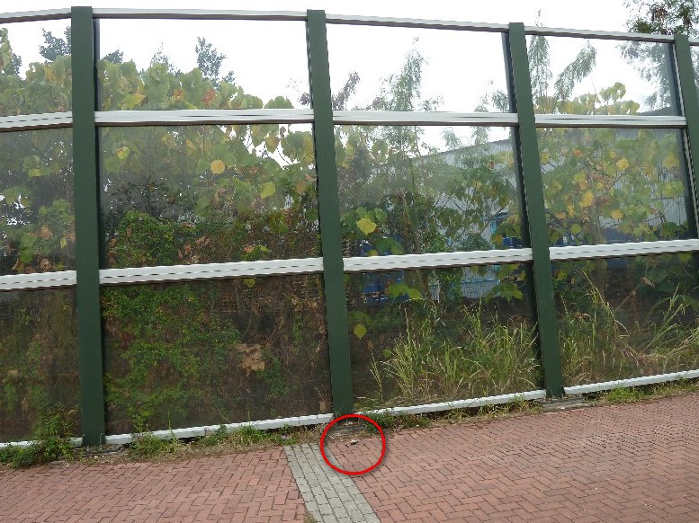 | 詳情地址 | 新界錦田東匯路近錦上路至錦甫路一段 | | | | | 日期 | 16/2/2011 | | | | | 雀鳥品種 | 紅耳鵯 | | | | | 懷疑撞擊物 | 隔音屏障 | | | | | 撞擊物面積 | 6 m X 300 m | | | | | 撞擊物座向 | 東南/西北 | | | | | 撞擊物狀態 | 全透明 | | | | | 雀鳥距離撞擊處 | 30cm | | | | | 撞擊處附近環境 | 行人路 | | | | | 受傷/死亡 | 死亡 | | | | | 備註 | 圖1及圖2: 現場環境