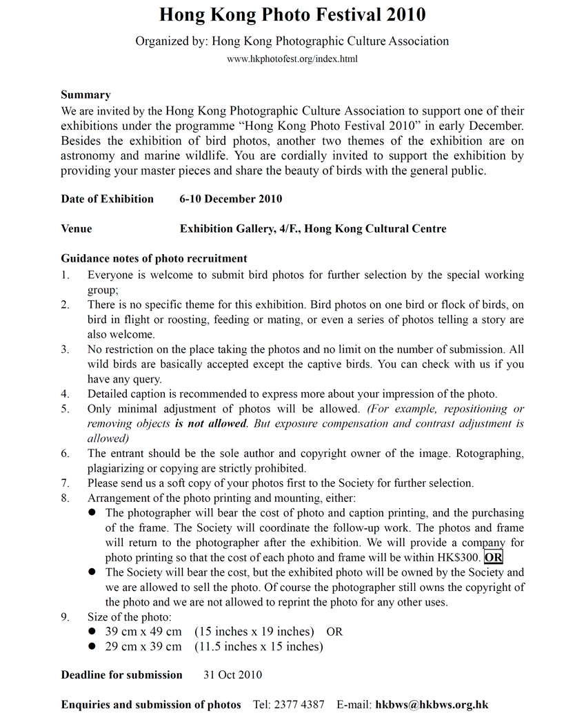 香港攝影節2010-鳥類相片徵募 HK Photo Festival 2010 Photos Recruit