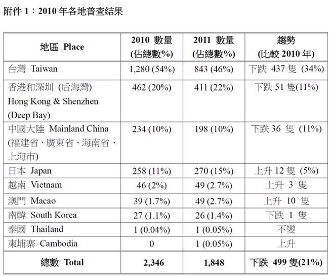 • 2011年的普查共記錄1,848隻,比2010年的2,347少了499隻,下跌21%;