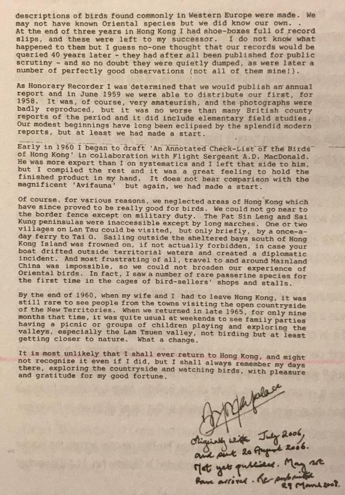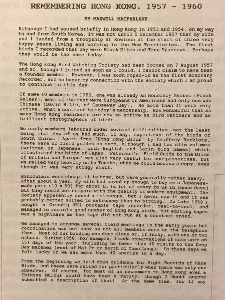 Mr. Macfarlane於1960年調任他處,但在1965至66年返港逗留了9個月,期間與J. Caunter更新了“Annotated Check-List of the Birds of Hong Kong”,並於1966年出版。
