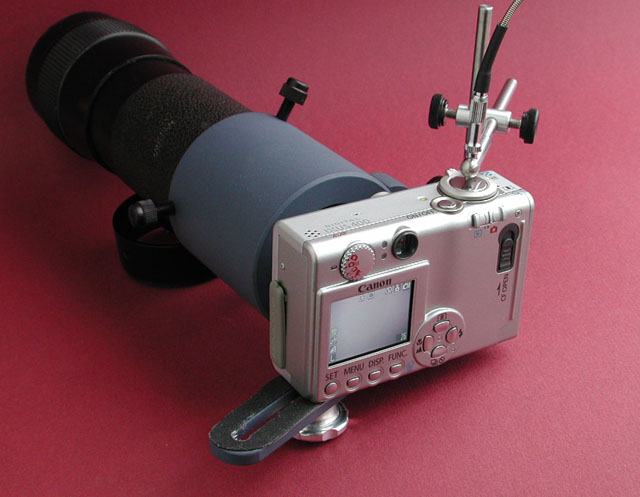 The sample in my hand is made for fitting Swarovski 30X eyepiece. The “cup” seems to be die-casted to fit my 30X eyepiece—good fitted. Switching form viewing to taking photo is indeed very easy. You just need to swing your camera out of the path for viewing, until the moment you wish to record an image. The camera is then switched on swung into the pre-set position and the picture taken.