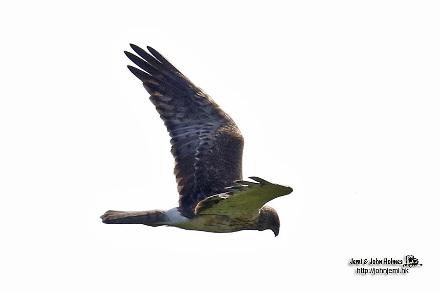 “Whitish underwing and rear underbody, greyish patches on upper primaries and a barred tail” (Viney,Phillipps and Lam, “The Birds of HK and South China”,2005).