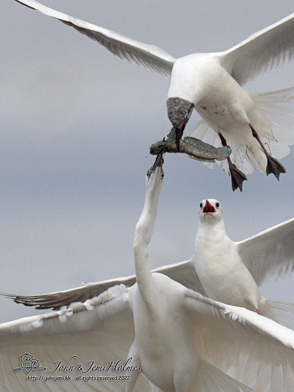[Egrets] Great Egret robbed by Black-headed Gulls