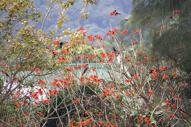 I saw a flock of 16 of these birds today at the Lions Nature education Centre. I managed one poor photo - the rest being deletes as they persisted, despite my pleas, in sitting high up against dull grey sky. This one was driving off another HCD. At least you can see the crest on it!
