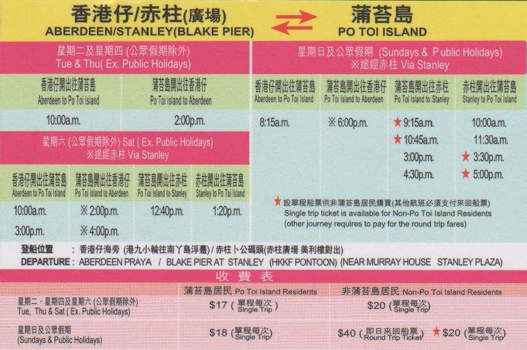(蒲台島開往赤柱於下午3:00 及4:30 開出; 蒲台島開往香港仔於下午6:00開出,參加者可自行決定回程時間)
