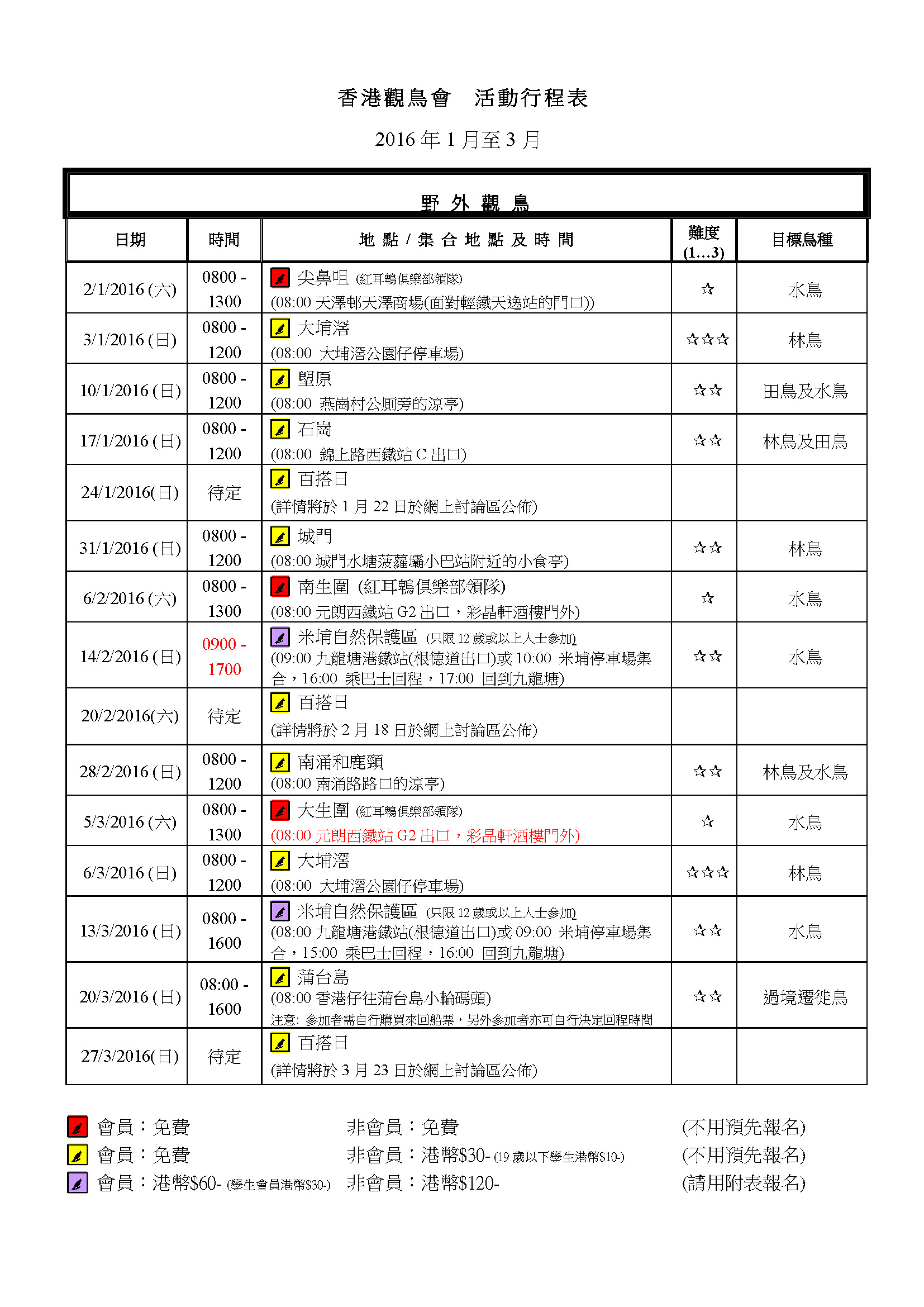 2016年1-3月戶外觀鳥活動時間表 Jan-Mar 2016 Outing Timetable