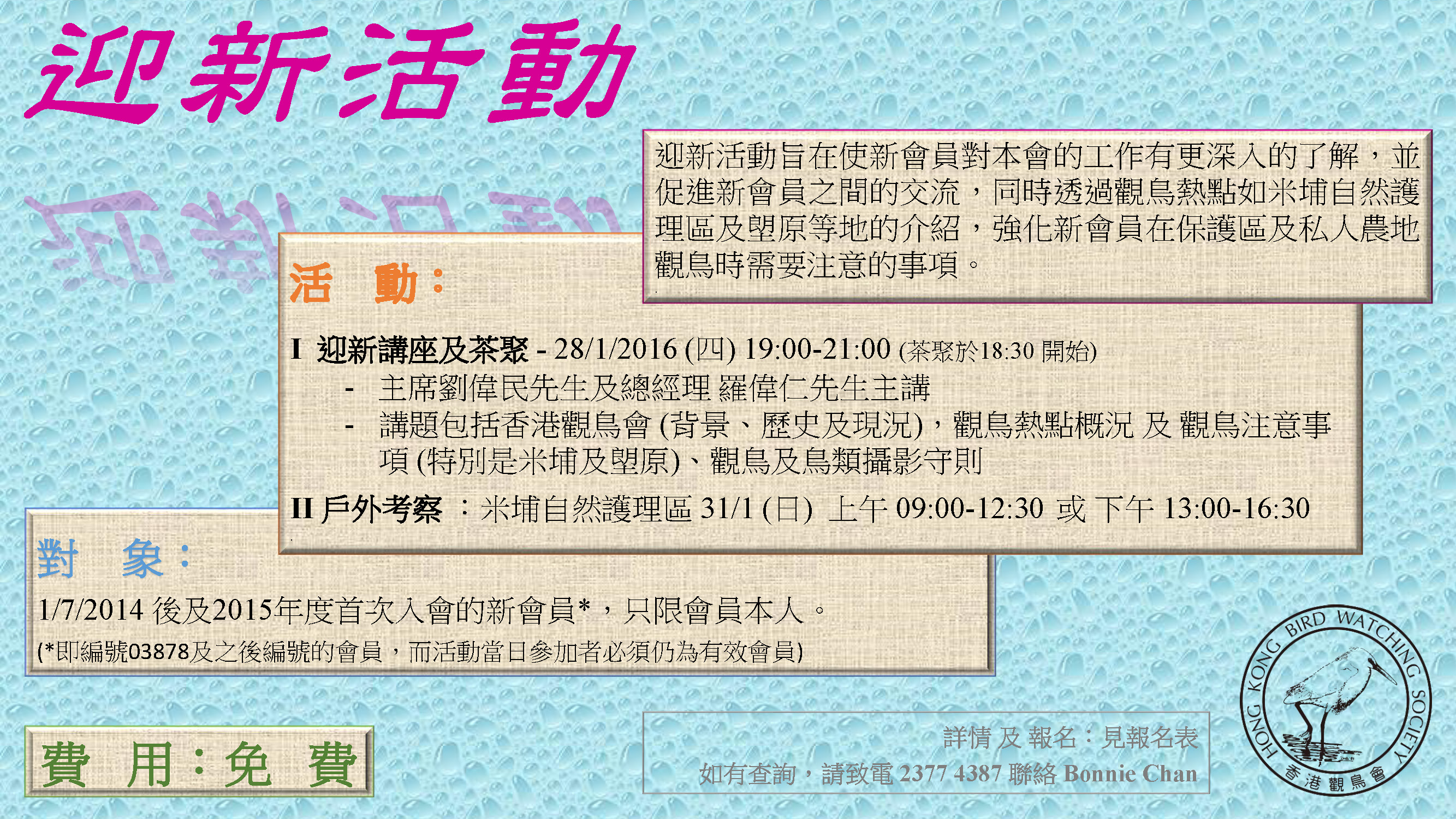 Original posted by alexkan at 3/01/2016 13:23 你好請問講座是在鳥會辨事署舉行嗎 謝謝