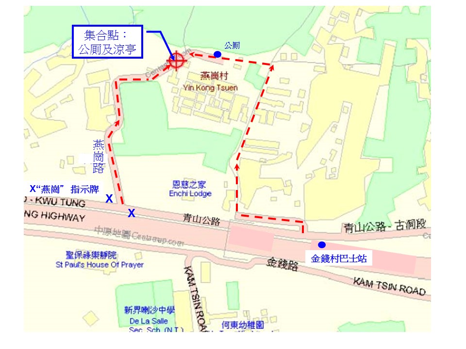 • Take red top mini bus no. 17 in San Fat Street, next to Sheung Shui Landmark, & alight at entry to Yin Kong Village or at Kam Tsin Village bus-stop. Then walk on foot following the route shown in the map below.
