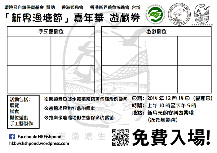 「新界漁塘節」是本港首項以漁塘保育為主題的大型保育及教育項目,而「新界漁塘節」的高潮正是在元朗安興遊樂場及大生圍一帶的漁塘舉行共兩天的嘉年華,日期分別是12月14日 (元朗安興遊樂場) 及12月20日 (大生圍漁塘)。