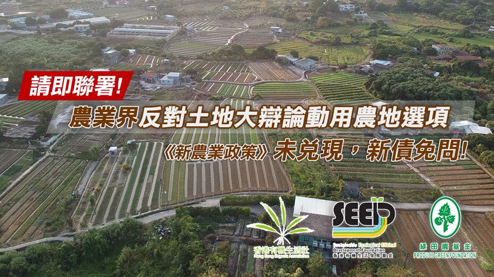 兩位特首在過去3份《施政報告》都有提及落實「新農業政策」,包括設立農業園和農業優先區,加強保護農地作為農業發展的根本。然而《農業優先區研究》剛於今年6月才進行顧問公司招標,政府預料顧問報告需要花上幾年時間完成,遠遠晚於土地大辯論的諮詢結果,反映政府欲放棄新農業政策的目標,採用「分餅仔」的方法,先動用未有政策保護的農地以逹成覓地工作,餘下的才劃作農業優先區。政府現時既不作打擊或制止破壞農地或農地棕土化,反而建議公私營合作模式,以公帑協助發展商解決基建設施,讓農地更輕易完成改劃程序,變相為發展商掃除發展限制,嚴重向發展商傾斜。如政府採納,意味農地囤積、破壞、農夫遭逼遷的趨勢將迅速加劇,新農業政策推動可持續農業發展的願景將蕩然無存。