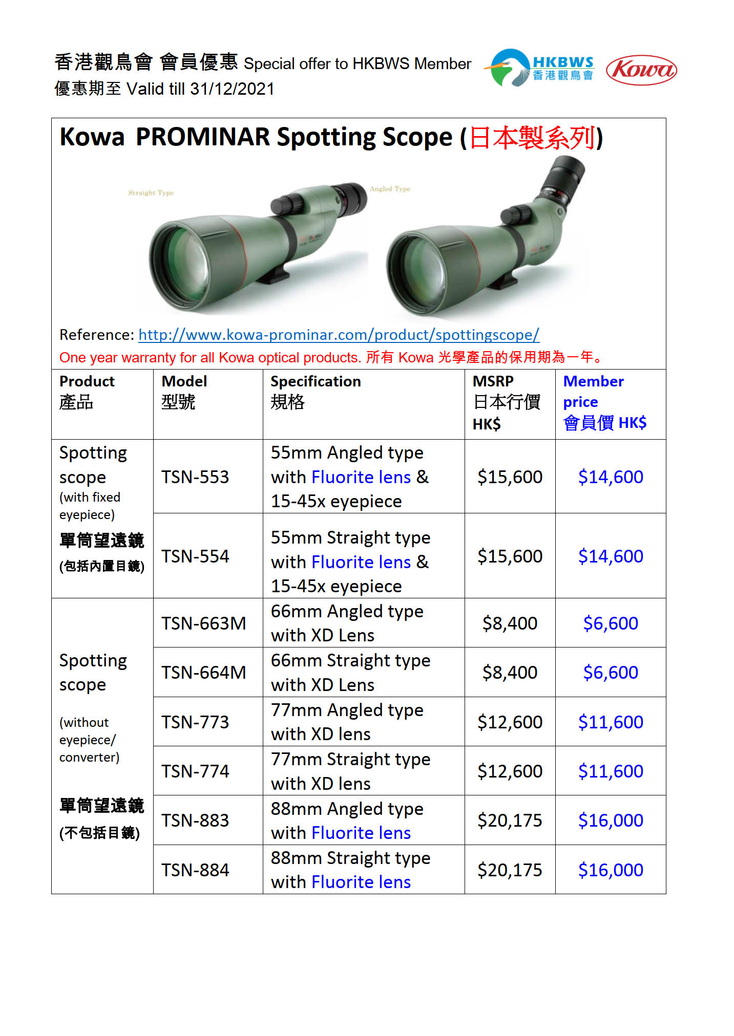 KOWA 望遠鏡優惠 ~ 2021年 8月 至 12月