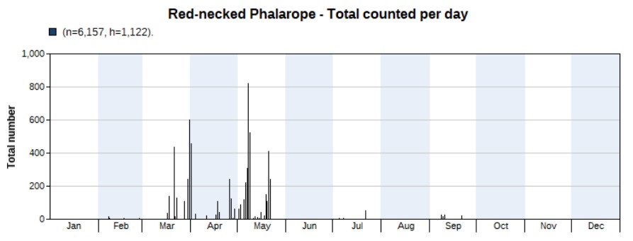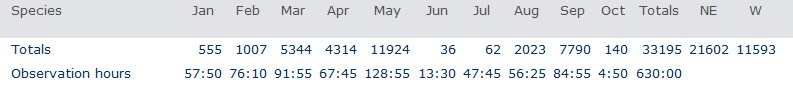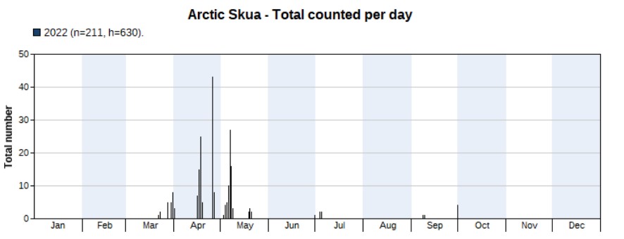 A total of 5,788 have been counted, the vast majority in spring. Highest counts were 821 on 7 May and 601 on 30 March. The high count in May is exceptionally for that month.