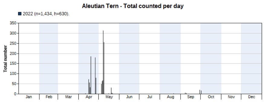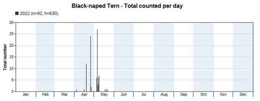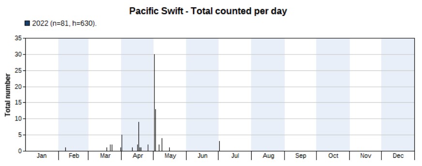 Same as Pacific Swift: much more were seen in 2022, but only from mid-April to early May (note that there were no surveys in November 2022, a month in which the species was seen in 2021). Highest count 62 on 1 May.