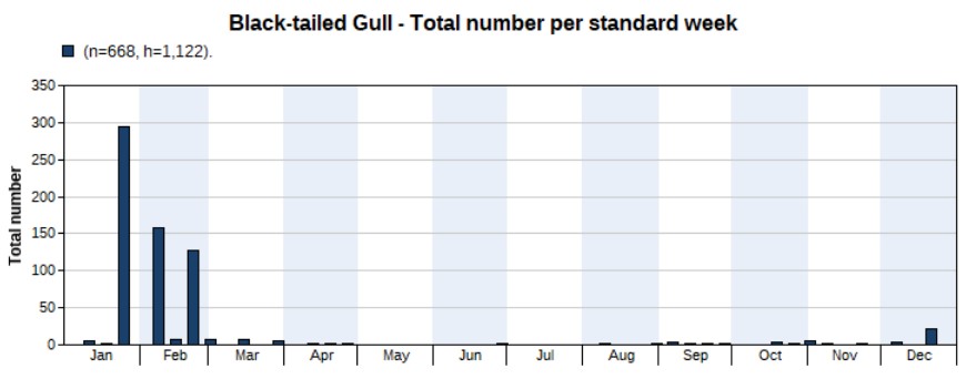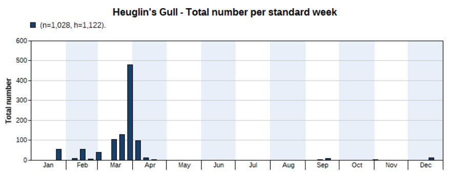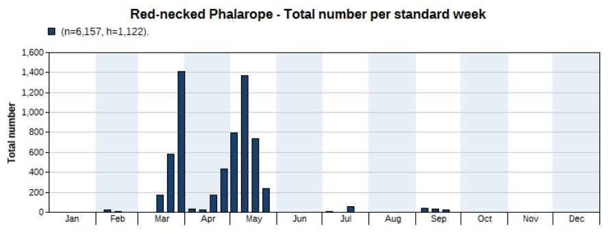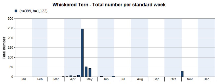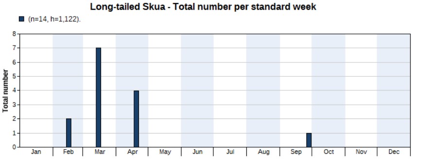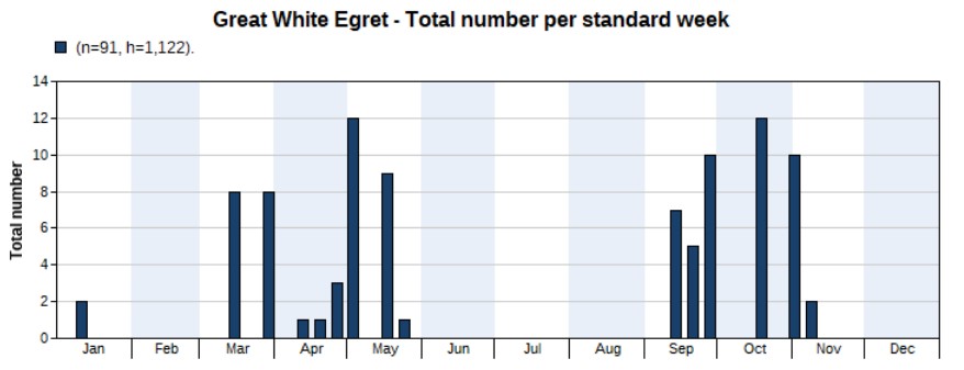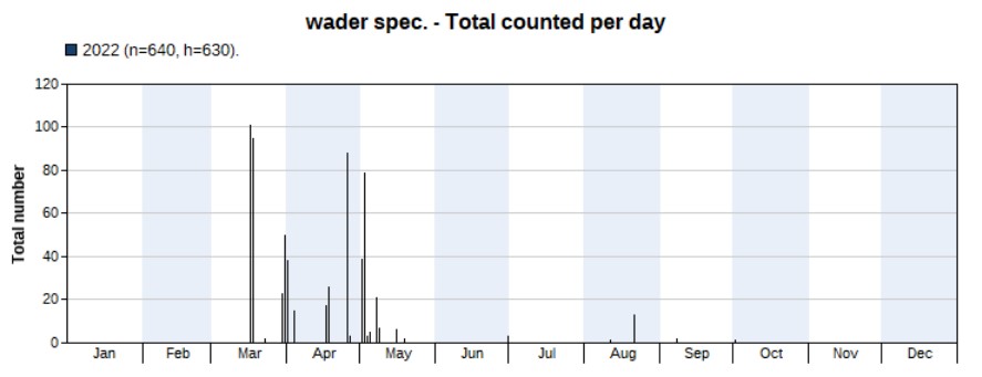 The total number of wader spec. (640), small wader spec. (28) and large wader spec. (6) amount to 674. The chart below shows wader spec. records, with an obvious peak in the spring months.