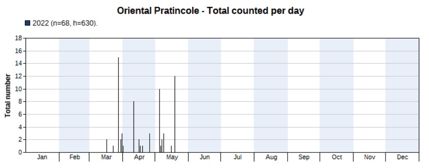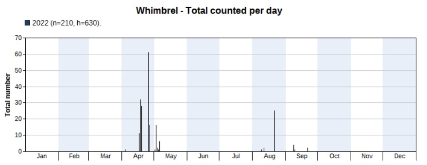 Many more were seen in 2022 than in 2021, with a very clear peak in spring (April and May). Highest count 30 on 1 May.